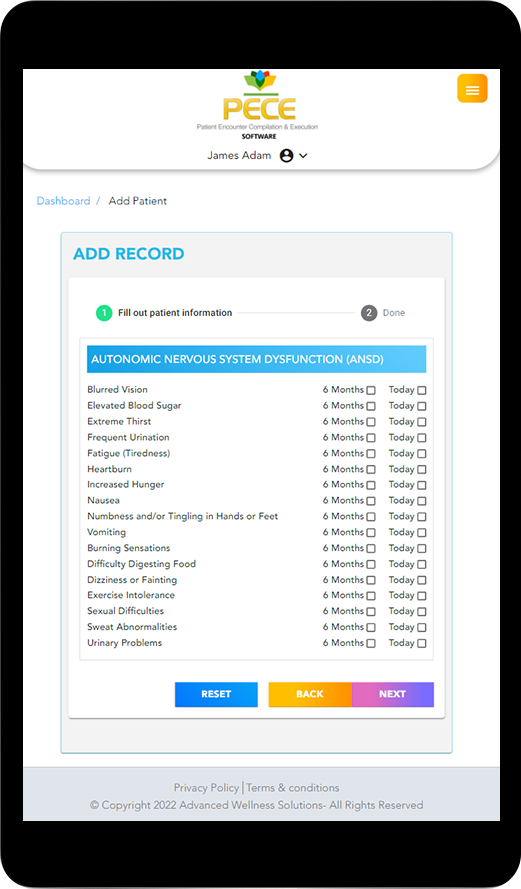 Patient details and symptom checklist information on the patient undergoing theANS test
