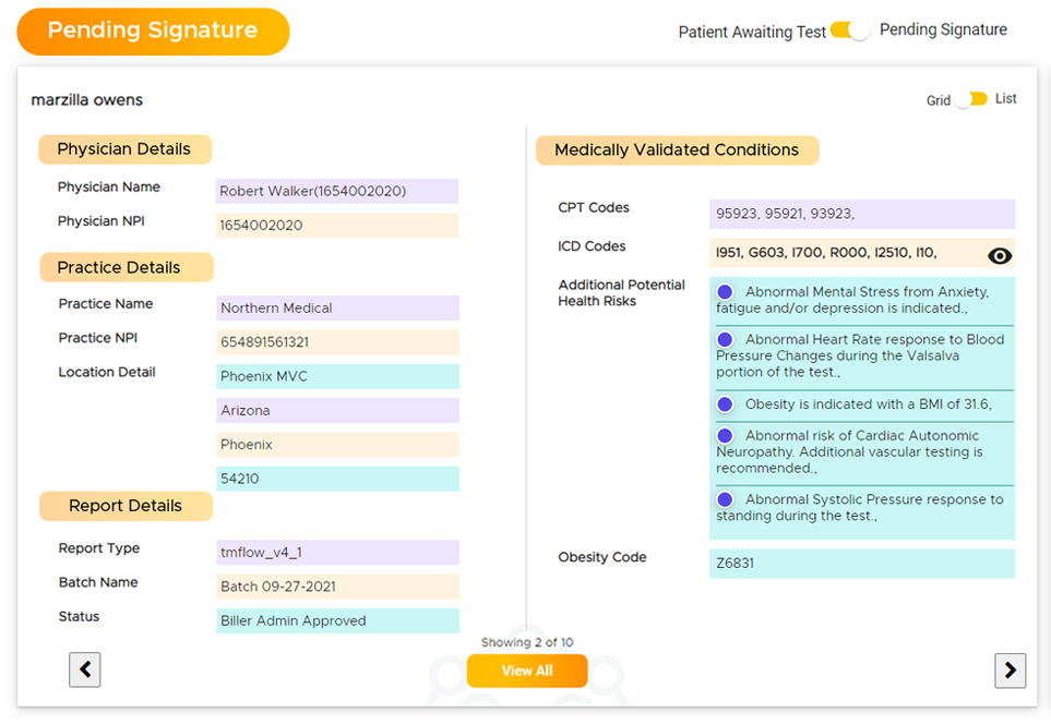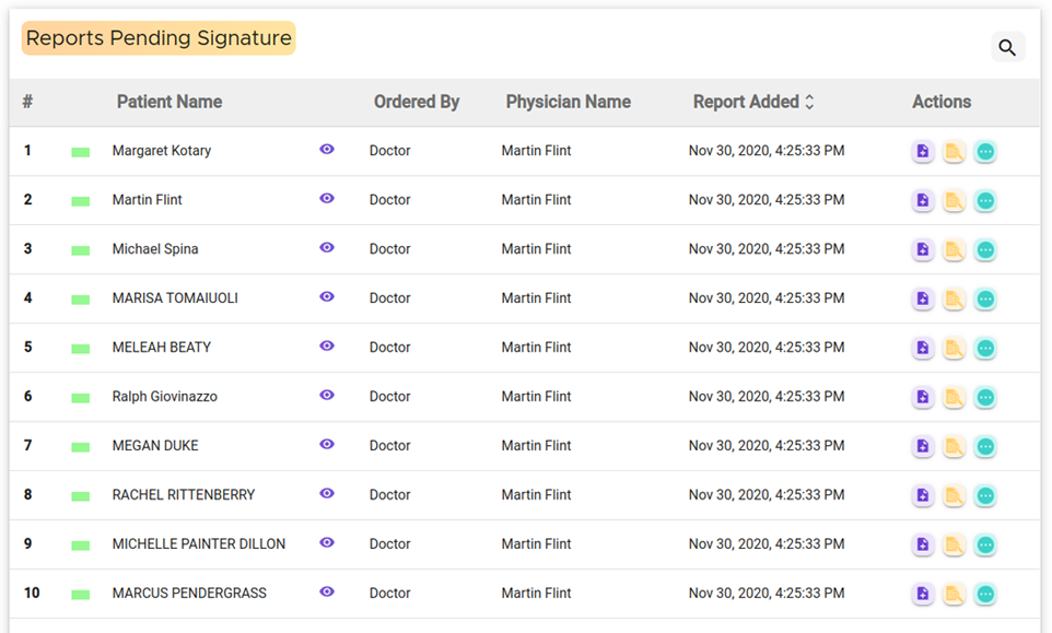 A specific widget comprises the list of those patients whose reports have been approved by the admin, but the doctor’s signature is pending. The physician can toggle from patient awaiting test to a pending signature through a simple toggling feature. Including: