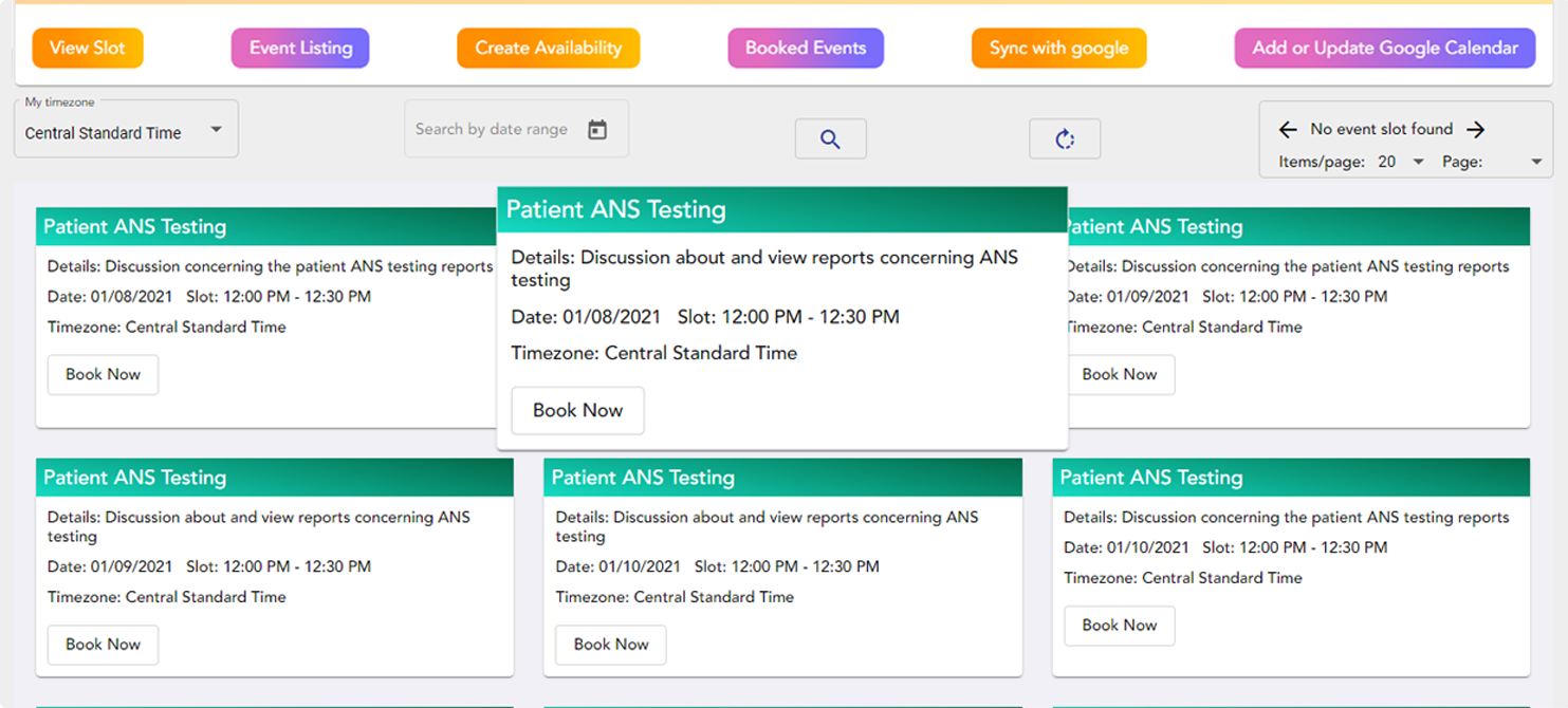 Med Techs can update their calendars to manage their availability for conducting the ANS tests.