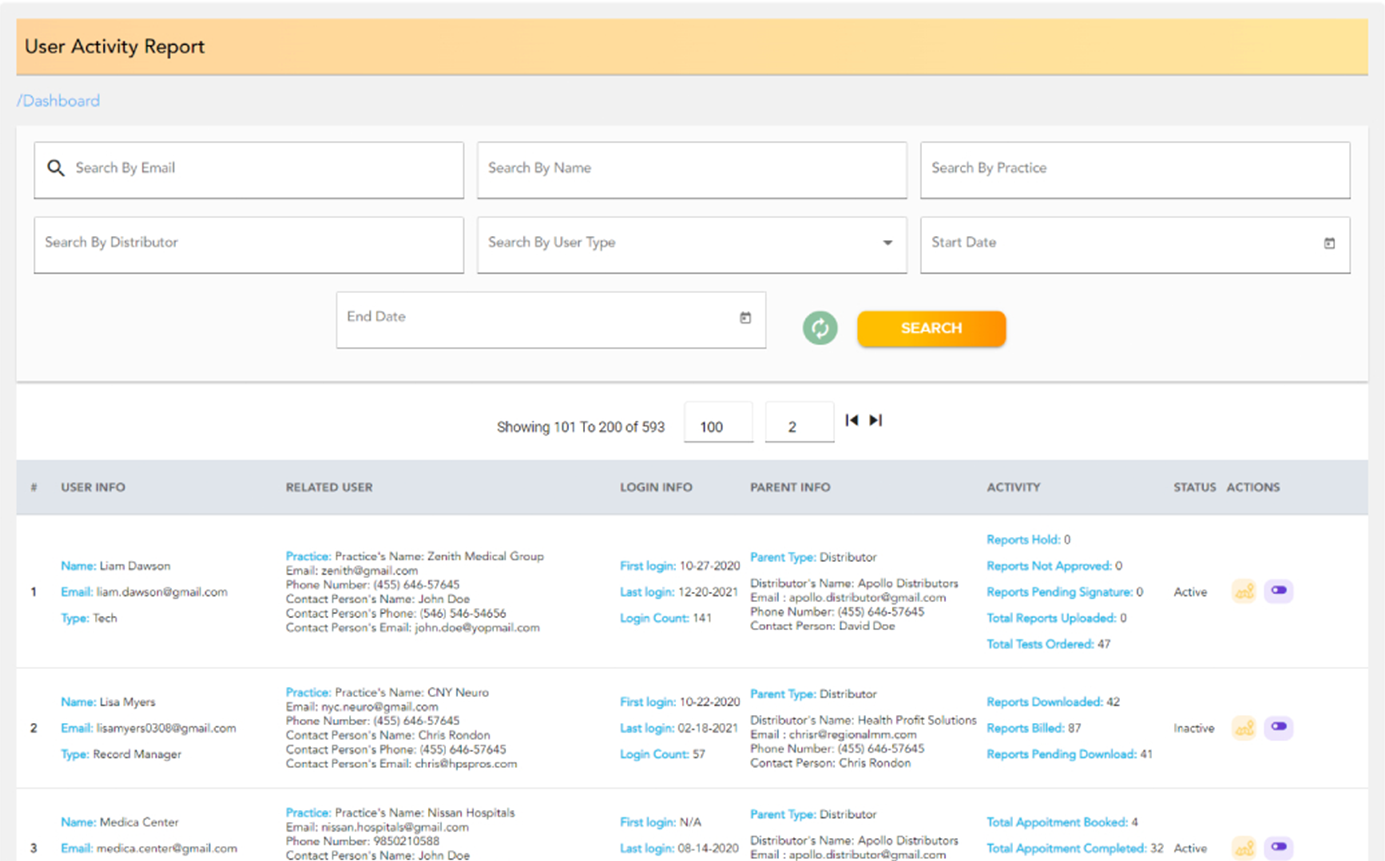 Activity reports of different user roles within your medical practice can be viewed along with other critical information Including: