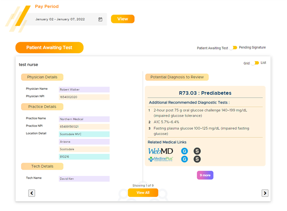 A specific widget comprises the list of those patients who have already submitted the intake form, but the ANS test coordination is left with the system-derived probable medical necessities of a patient. Including: